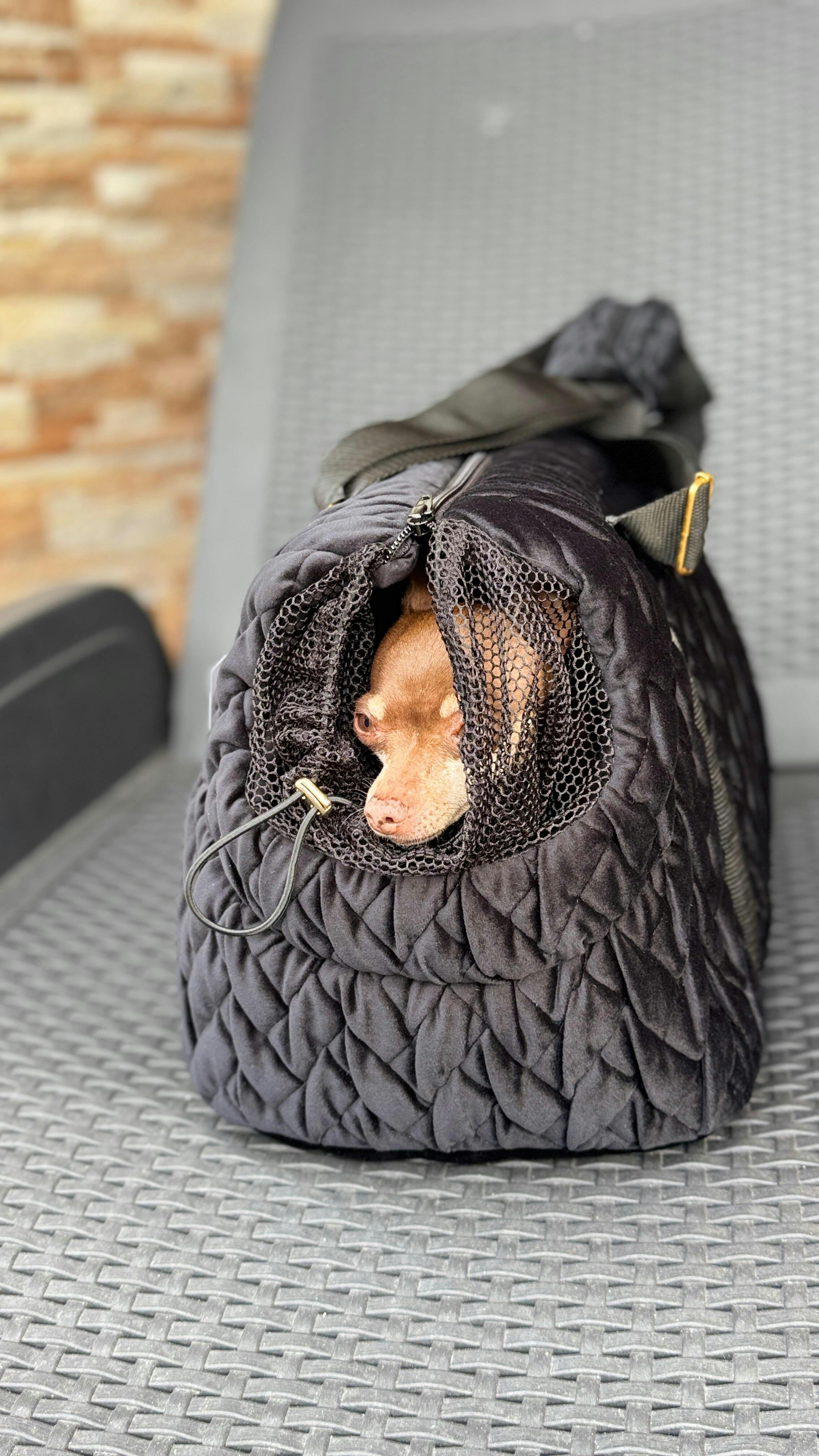 Muffin & Berry carrier is a handmade and irreplaceable accessory to help you and your puppy enjoy the day out. Pet carrier is comfortable & spacious, and is a perfect choice for any occasion! Shoulder straps are length adjustable so they fit to any height. You can carry the bag as a handbag, or on your shoulder and even cross-body. Velour exterior is very practical & luxury looking. Carrier has spongy bottom & firm pillow inside for better weight support. For your convenience pillow is removable & machine-washable. 100% cotton interior is very smooth, breathable and durable at the same time. There are 2 pockets on the inside of a carrier for your personal belongings. Each carrier comes with the safety leash on the inside & shoulder padding. Muffin & Berry carrier provides an exceptional comfort and coziness!